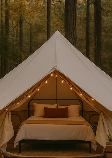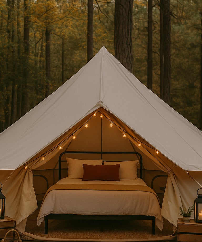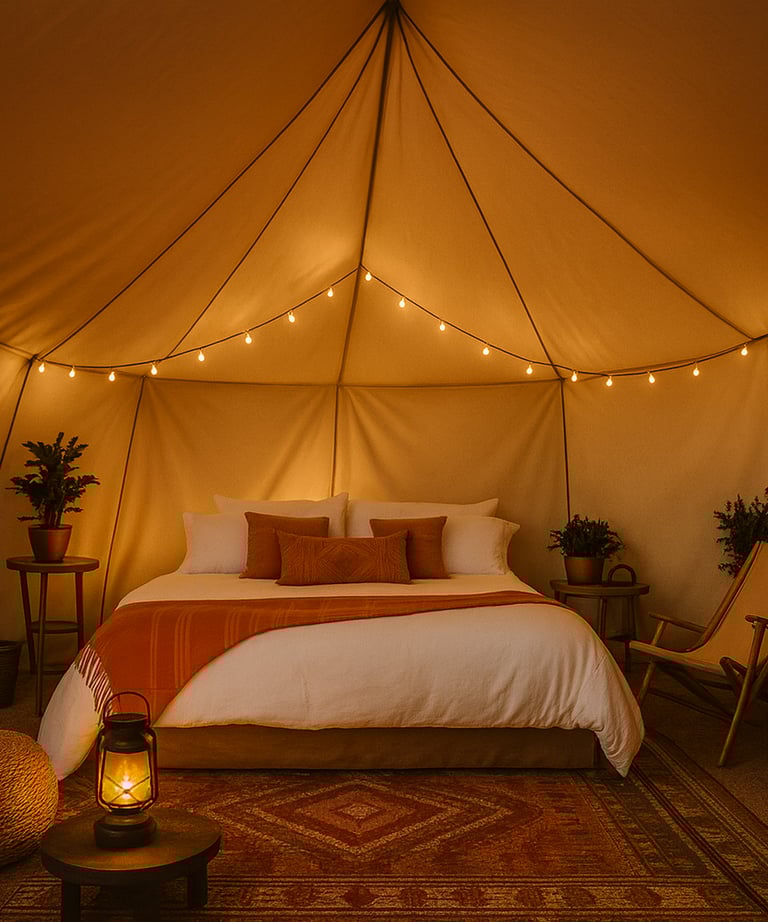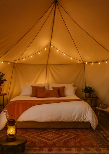 An elevated camping experience featuring cozy textures, curated décor, and a warm, inviting atmosphere.