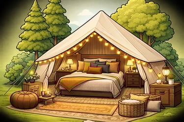 Featuring layered bedding, plush textures, ambient lighting, and curated styling, this setup transforms your tent into a serene retreat.